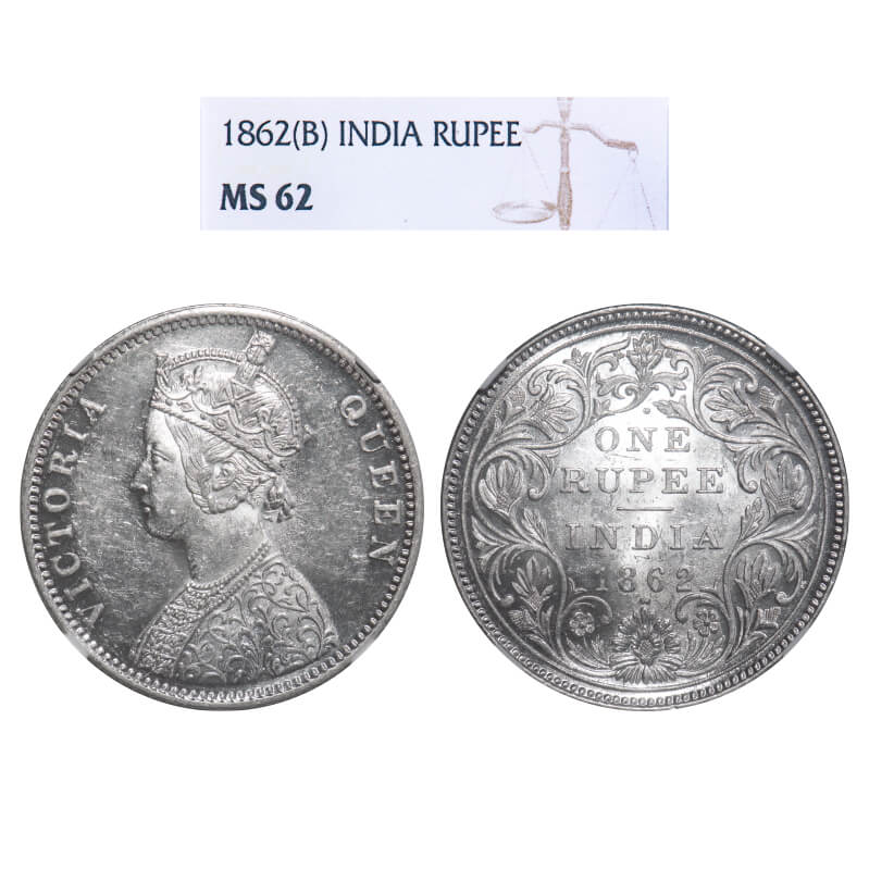 Victoria Queen, Silver, Rupee, 1862, Bombay Mint, A/II/1/2, w/o initial 'J', Inclined 1. F. Prid 103. GK 358. NGC Slabbed MS 62. Rare.
