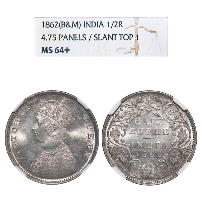 Victoria Queen, Silver, Half Rupee, 1862, Calcutta Mint, C/II, Round Pearls, 5 petals flower with raised veins in centre of the petals. F. Prid 252. GK 367. NGC Slabbed MS 64+. Extremely Rare.