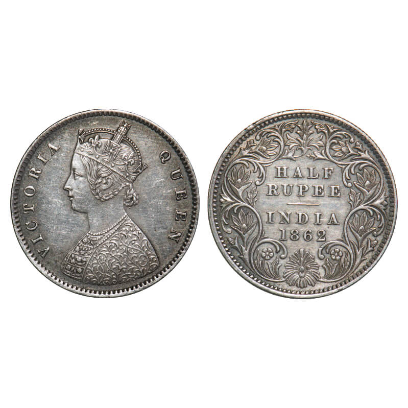 Victoria Queen, Silver, Half Rupee, 1862, Calcutta Mint, A/I, Round Pearls, Mechanical die doubling of raised veins in petals on Rev. F. Prid 255. GK 370. About Uncirculated. Very Scarce.