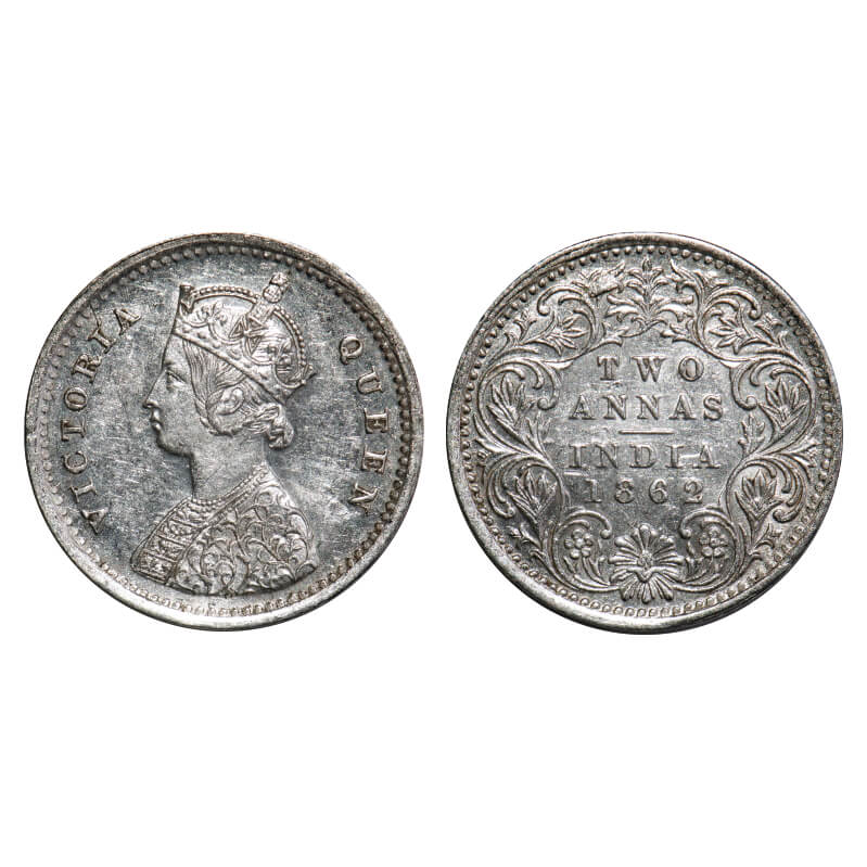 Victoria Queen, Silver, 2 Annas, 1862, Bombay Mint, A/I, Bottom flower centre top petal broader then Left and Right connecting petal, Ghost on Rev. F. Prid 486. GK 383. Uncirculated. Very Scarce.