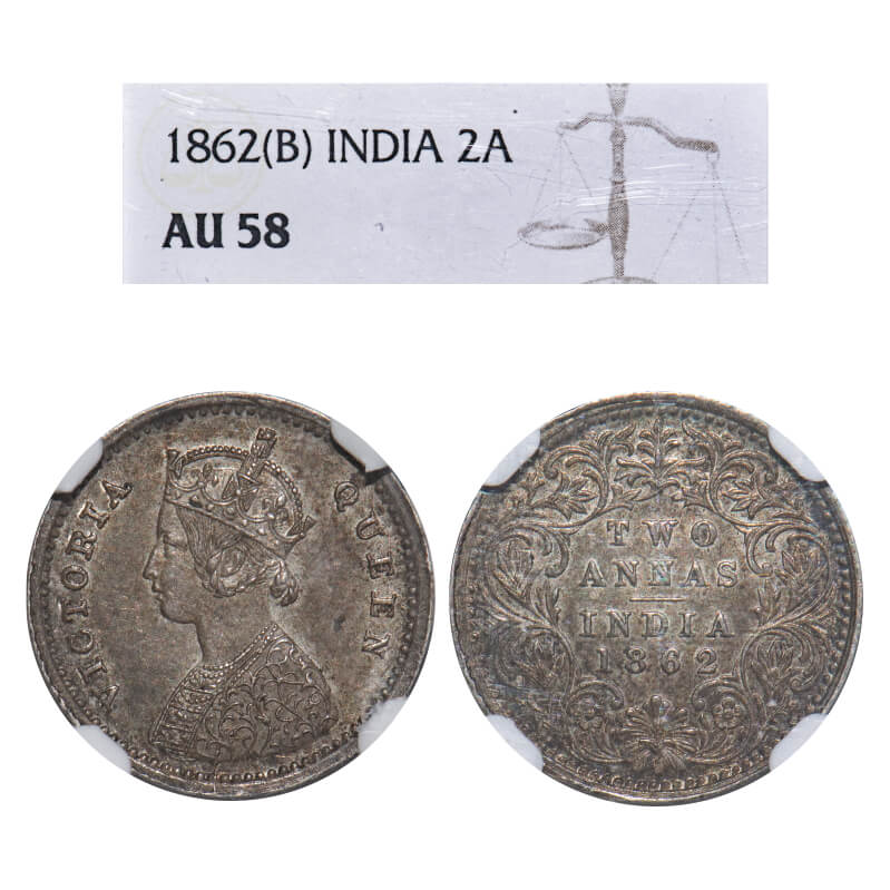 Victoria Queen, Silver, 2 Annas, 1862, Bombay Mint, A/I, Bottom flower centre top petal broader then left and right connecting petals. F. Prid 486. GK 383. NGC Slabbed AU 58. Very Scarce.