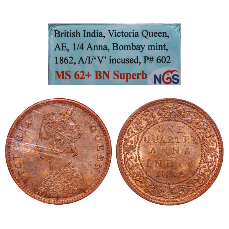 Victoria Queen, Copper, Quarter Anna, 1862, Bombay Mint, A/I, No mint mark, Tiny 'V' incused. F. Prid 602. GK 397. NGS Slabbed MS 62+ BN Superb. Rare.