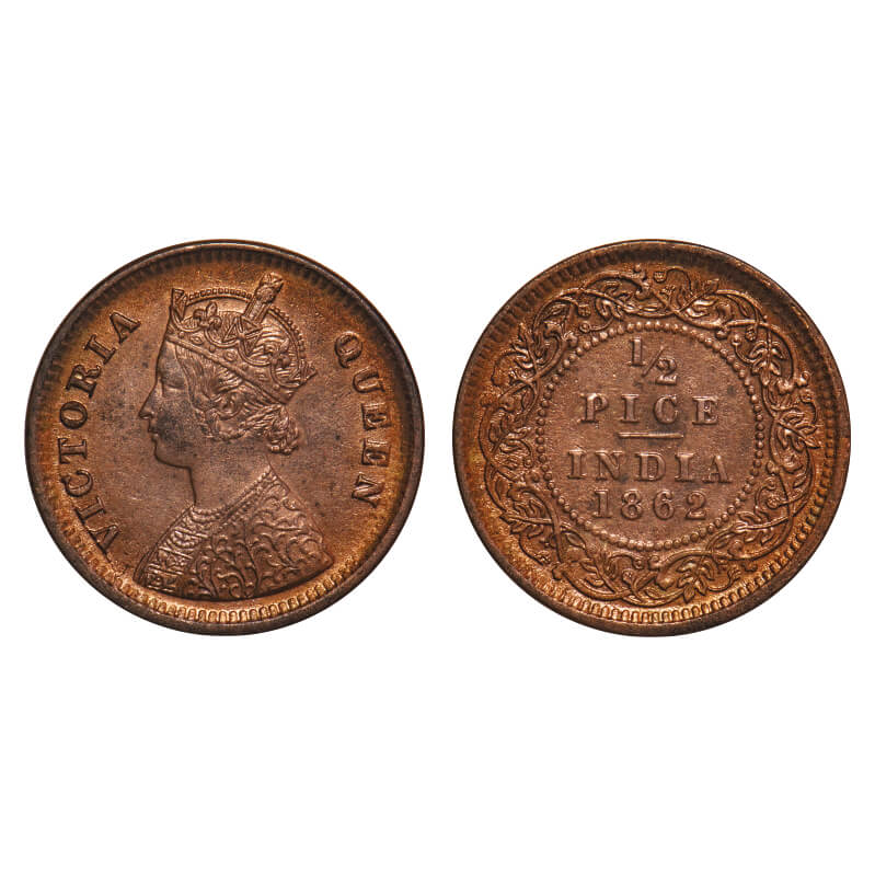 Victoria Queen, Copper, 1/2 Pice, 1862, Calcutta Mint, A/I. F. Prid Unlisted. GK 400. Almost Uncirculated, Details, Cleaned. Very Scarce.