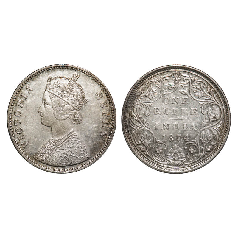 | Victoria Queen, Silver, Rupee, 1874, A/II, No mint mark, Obv A of 1862 on 1874, (Since fix date system was stopped from this year and a new Obv design was adopted, this particular Obv of 1862 on 1874 is very rare), Mechanical die doubling of year date 1874, Inclined 1. F. Prid Unlisted. GK Unlisted. Extremely Fine+. Very Rare. |