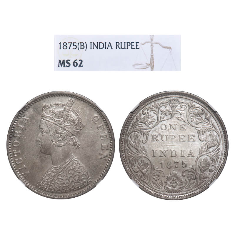 | Victoria Queen, SIlver, Rupee, 1875, Bombay Mint, A2/II, Dot, Top stroke of numeral 5 long, Flat 1. F. Prid 146. GK 424. NGC Slabbed MS 62. Rare. |