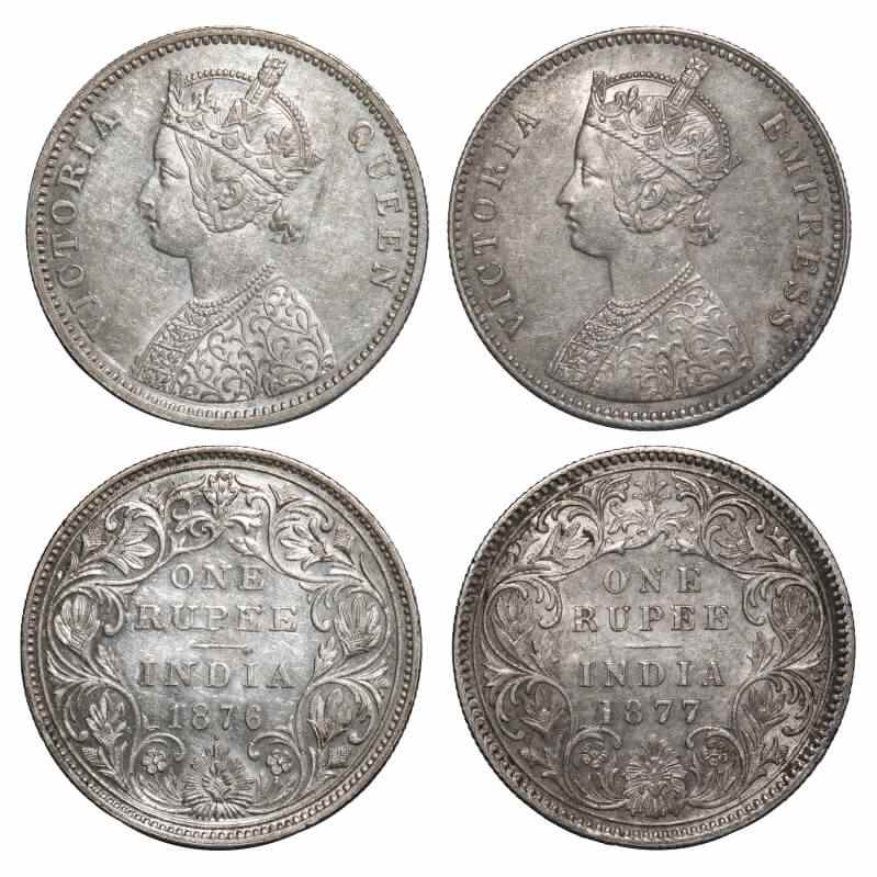 | Victoria Queen & Empress, Silver, Rupee, (2 coins), 1) 1876, Bombay Mint, A2/II, Dot, Inclined 1, 2) 1977, Calcutta MInt, A1/I, No mint mark, Flat 1. F. Prid 147, 115. GK 430, 446. Extremely Fine to Almost Uncirculated. Scarce. |