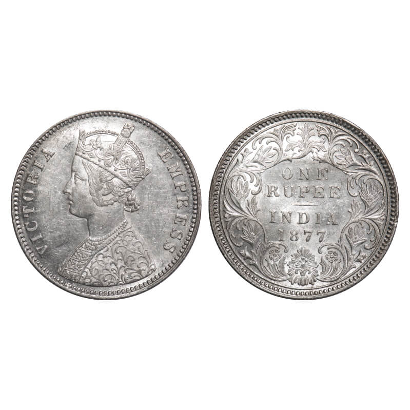| Victoria Empress, Silver, Rupee, 1877, Calcutta Mint, A1/I, No mint mark, Thin numeral 77, Die crack on Obv, Flat 1. F. Prid Unlisted. GK 437. Extremely Fine+. Very Scarce. |