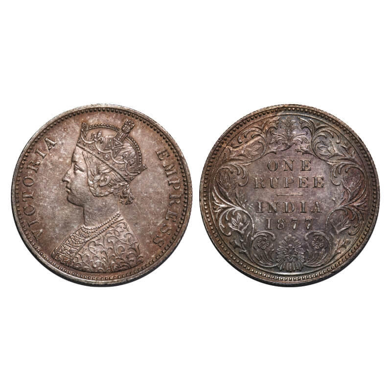 | Victoria Empress, Silver, Rupee, 1877, Bombay Mint, A3/I, Dot, Flat 1. F. Prid 150. GK 444. Uncirculated, Toned. Very Scarce. |