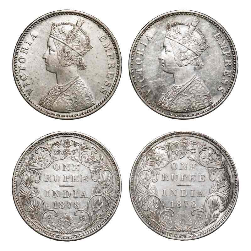 | Victoria Empress, Silver, Rupee, (2 coins), 1878, Bombay Mint, Dot, 1) A3/II(i), 2) A3/II(ii). F. Prid 151, Unlisted. GK 451, 453. Very Fine+ to About Uncirculated. Very Scarce. |