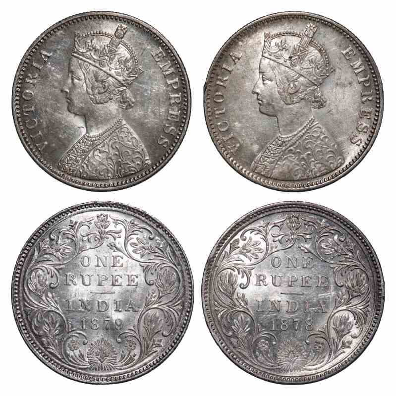 | Victoria Empress, Silver, Rupee, (2 coins), 1878, 1879, Bombay Mint, A3/II(i), Dot, Inclined 1. F. Prid 151, Unlisted. GK 451, 456. About Uncirculated to Almost Uncirculated. Scarce. |