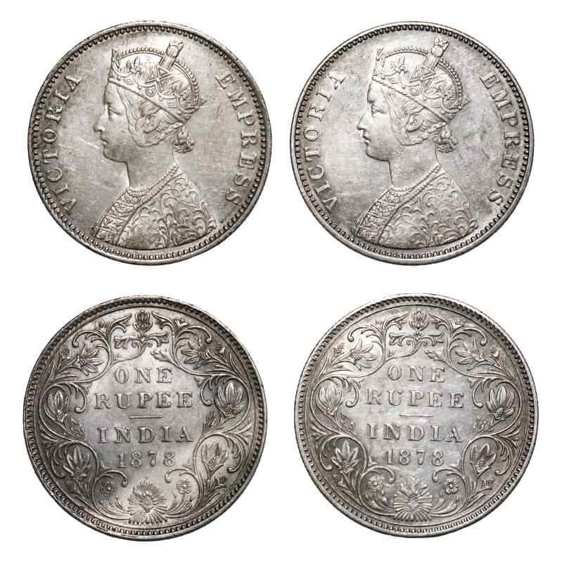 | Victoria Empress, Silver, Rupee, (2 coins), 1878, Bombay Mint, A3/II(ii), Dot, Inclined 1. F. Prid Unlisted(2). GK 453(2). Very Fine to Very Fine+. Scarce. |