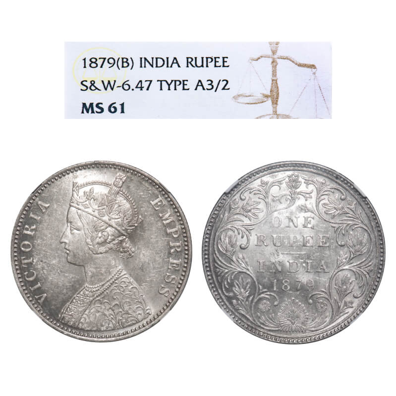 Victoria Empress, Silver, Rupee, 1879, Bombay Mint, A3/II(iii), Dot, Inclined 1. F. Prid 153. GK 458. NGC Slabbed MS 61. Rare.