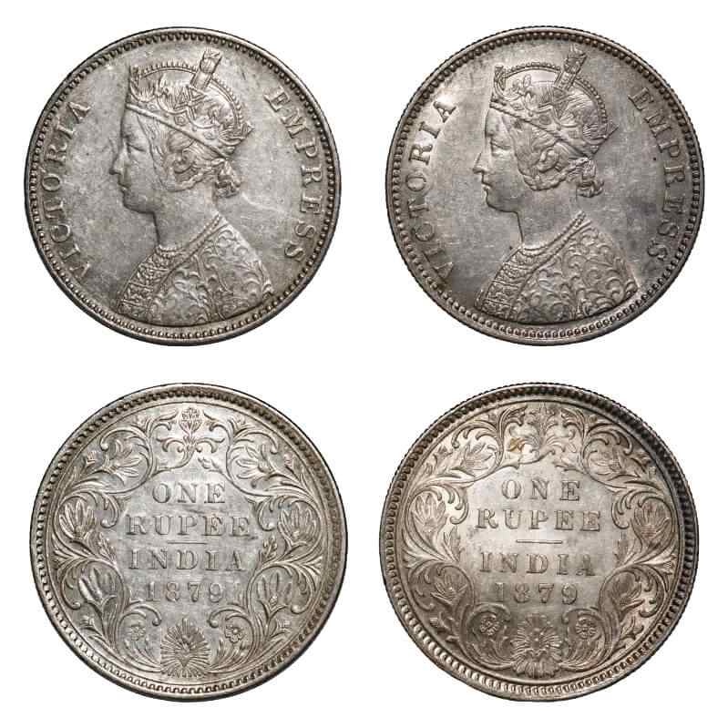 | Victoria Empress, Silver, Rupee, (2 coins), 1879, Bombay Mint, 1) A3/I, No dot, Inclined 1, 2) A3/II(iv), Dot, Inclined 1. F. Prid Unlisted, Unlisted. GK 459, 462. Very Fine to About Uncirculated. Scarce. |