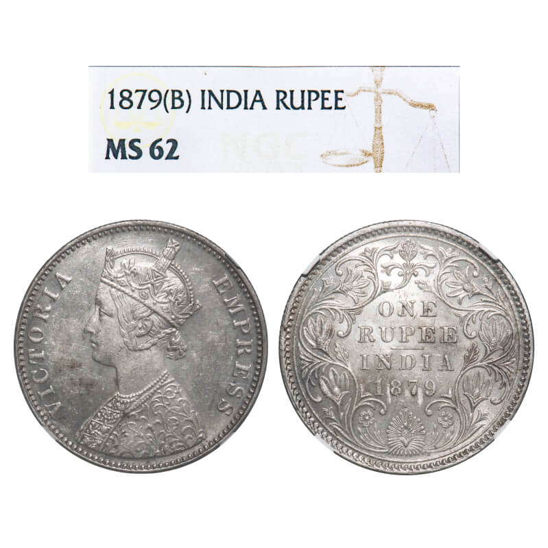 Victoria Empress, Silver, Rupee, 1879, Bombay Mint, A3/II(iv), Dot, Inclined 1. F. Prid Unlisted. GK 462. NGC Slabbed MS 62. Rare.