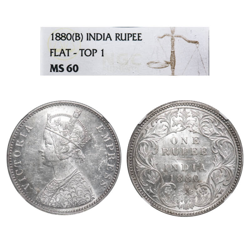 Victoria Empress, Silver, Rupee, 1880, Bombay Mint, A3/I, Dot, Flat 1. F. Prid 156. GK 466. NGC Slabbed MS 60. Very Scarce.