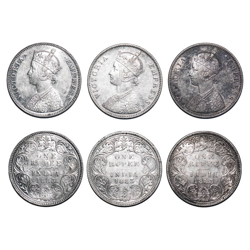 | Victoria Empress, Silver, Rupee, (3 coins), 1883, Bombay Mint, 1) A3/I, Dot, Flat 1, 2 & 3) A3/I, 'B' raised, Flat 1. F. Prid 162, 164(2). GK 477, 483(2). Extremely Fine + to Almost Uncirculated. Very Scarce. |