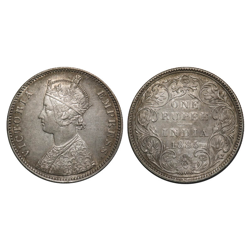 | Victoria Empress, Silver, Rupee, 1885, Bombay Mint, A3/II(i), 'B' raised, Top stroke of numeral 5 short, Inclined 1. F. Prid 168. GK 496. About Uncirculated. Very Scarce. |
