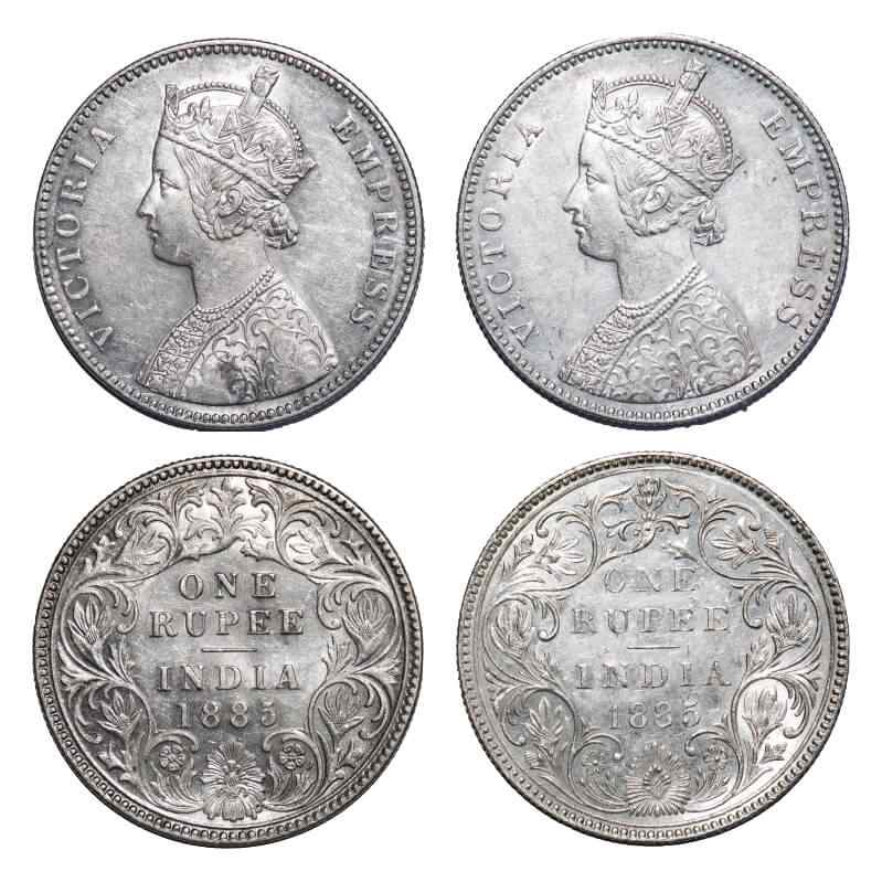 | Victoria Empress, Silver, Rupee, (2 coins), 1885, 1) Bombay Mint, A3/II(i), 'B' raised, top stroke of numeral 5 long, Inclined 1, 2) Calcutta Mint, A1/I, 'C' incused, Top stroke of numeral 5 short, Flat 1. F. Prid 168, 124. GK 497, 518. Extremely Fine+ to Almost Uncirculated. Rare. |