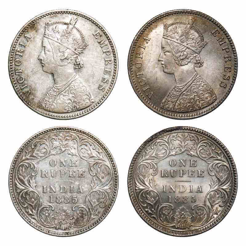 | Victoria Empress, Silver, Rupee, (2 coins), 1885, 1) Bombay Mint, A3/I, 'B' raised, Flat 1, 2) Calcutta Mint, A1/I, 'C' incused, Top stroke of numeral 5 short, Flat 1. F. Prid 169, 124. GK 503, 518. Very Fine+ to Almost Uncirculated. Very Scarce. |