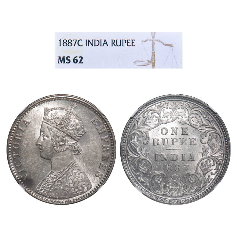 Victoria Empress, Silver, Rupee, 1887, Calcutta Mint, C3/I(i), 'C' incused. F. Prid 128. GK 549. NGC Slabbed MS 62. Rare.