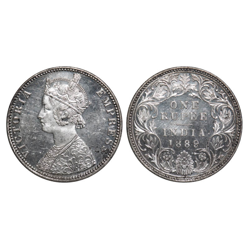 | Victoria Empress, Silver, Rupee, 1889, Bombay Mint, C2/I, 'B' incused, Flat 1. F. Prid 177. GK 564. Mint State, Proof like luster. Very Rare. |