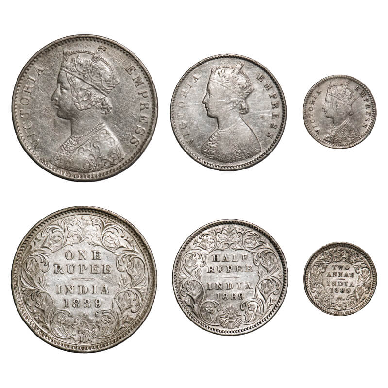 | Victoria Empress, Silver, 1889 (3 coins), Calcutta Mint, 1) Rupee, C3/I(i), 'C' incused, Flat 1, 2) Half Rupee, A/I, 'C' incused, 3) 2 Annas, B/II, 'C' incused. F. Prid 130, 273, 504. GK 565, 645, 788. Very Fine to Very Fine+. Very Scarce. |