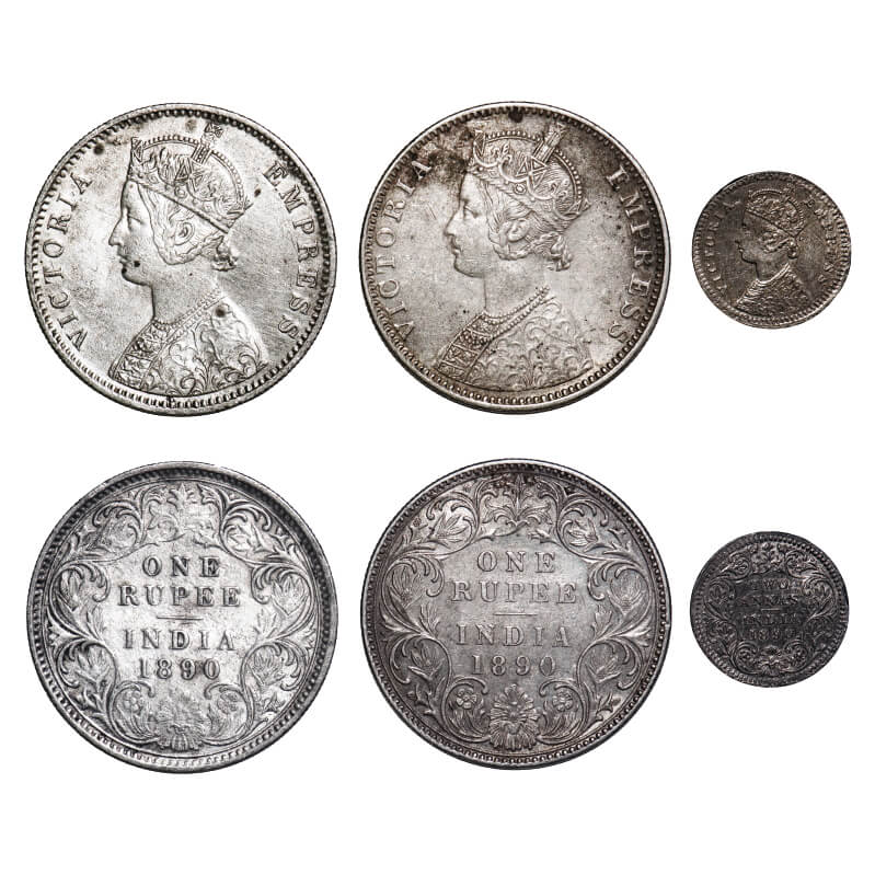 | Victoria Empress, Silver, 1890, (3 coins), 1) Rupee, Bombay Mint, C2/I, 'B' incused, Flat 1, 2) Rupee, Calcutta Mint, C3/I(i), Flat 1, 'C' incused, 3) 2 Annas, Calcutta Mint, B/II, 'C' incused. F. Prid 178, 131, 505. GK 566, 567, 793. Very Fine to About Uncirculated. Scarce. |