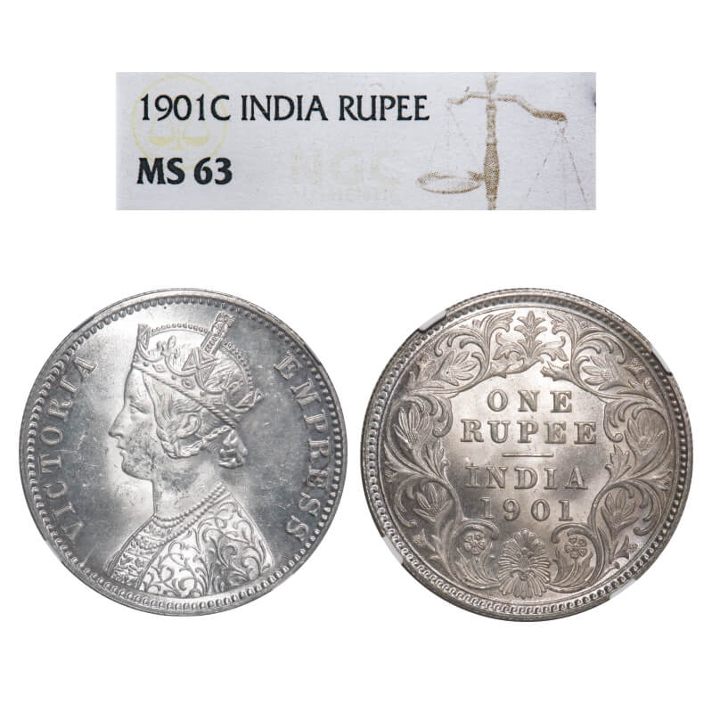 Victoria Empress, Silver, Rupee, 1901, Calcutta Mint, C3/I(i), 'C' incused, Flat 1. F. Prid 139. GK 598. NGC Slabbed MS 63. Very Rare.
