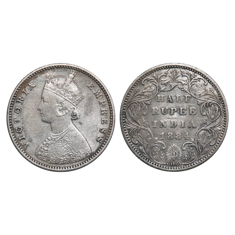 Victoria Empress, Silver, Half Rupee, 1884, Bombay Mint, A/II(i), No dot, Centre verticle stroke in top flower is short and thin. F. Prid 293. GK 627. Very Fine. Very Scarce.