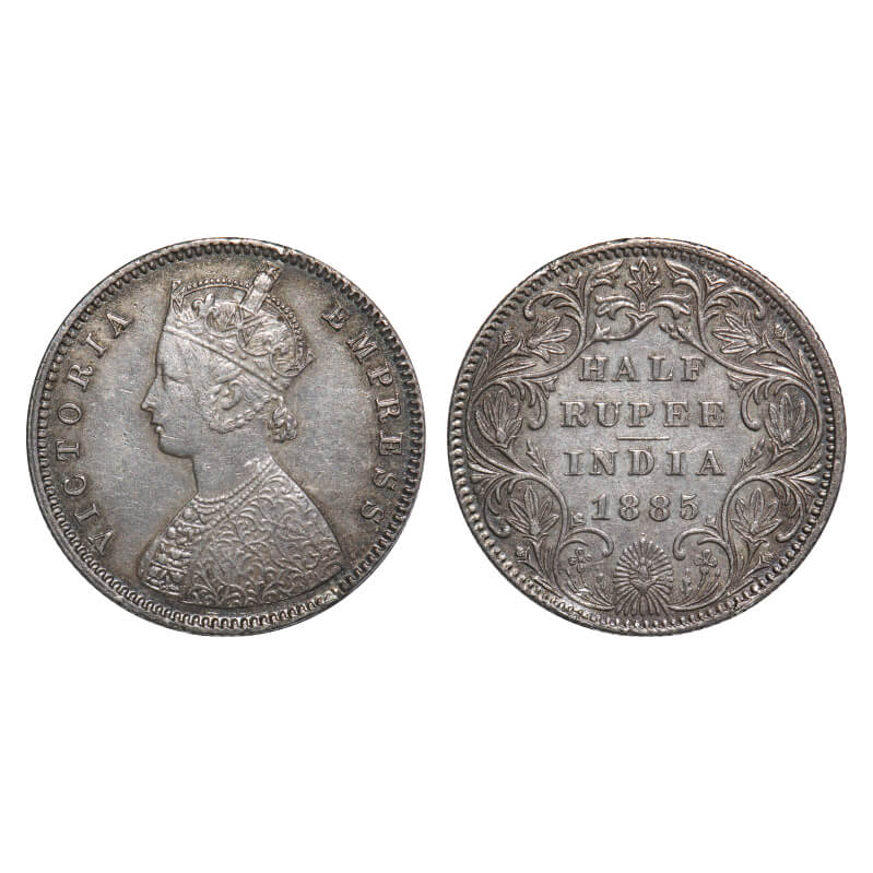 | Victoria Empress, Silver, Half Rupee, 1885, Bombay Mint, A/II(i), 'B' raised and dot, Dual mint marks, Ex-Mount. F. Prid Unlisted. GK 629. Extremely Fine+. Rare. |