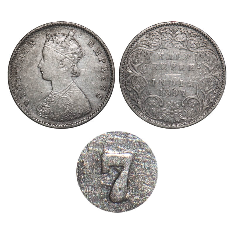 Victoria Empress, Silver, Half Rupee, 1897, Bombay Mint, A/I, 'B' incused, Traces of numeral 4 seen behind numeral 7. F. Prid 305. GK 653. Very Fine+. Rare.