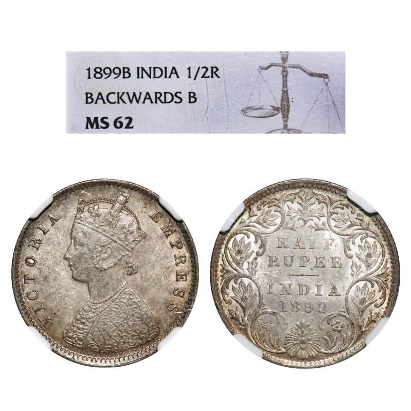 Victoria Empress, Silver, Half Rupee, 1899, Bombay Mint, A/I, 'B' incused, B incused inverted. F. Prid 307. GK 662. NGC Slabbed MS 62. Rare.