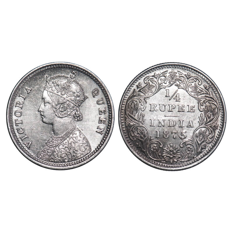 Victoria Queen, Silver, 1/4 Rupee, 1875, Bombay Mint, A/I, No dot, Ghost on Rev. F. Prid 406. GK 666. Extremely Fine+. Rare.