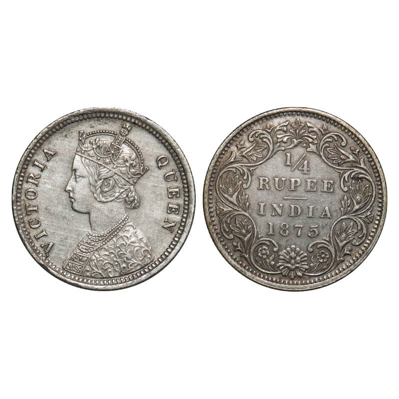 Victoria Queen, Silver, 1/4 Rupee, 1875, Bombay Mint, A/I, No dot, Nick on the Obv rim edge. F. Prid 406. GK 666. Extremely Fine. Rare.