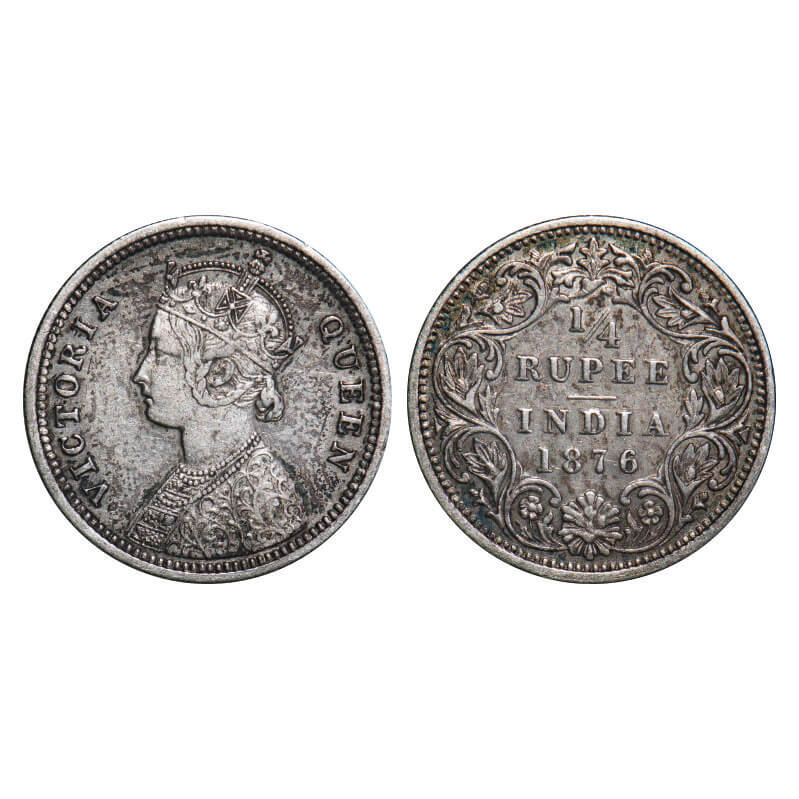 Victoria Queen, Silver, 1/4 Rupee, 1876, Bombay Mint, A/I, No dot. F. Prid 407. GK 668. Very Fine. Very Scarce.