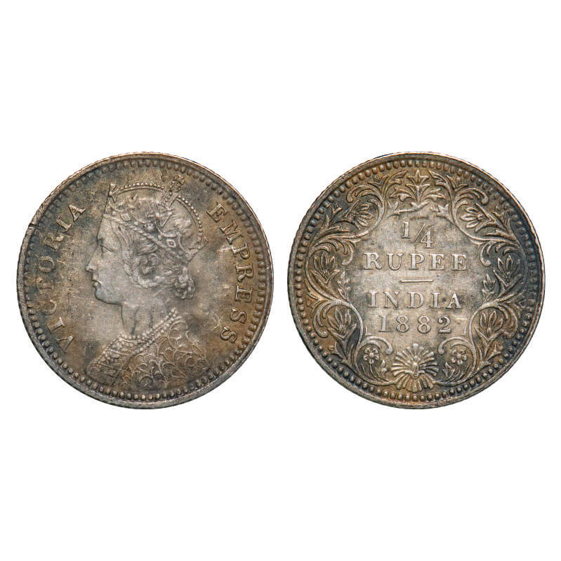 Victoria Empress, Silver, 1/4 Rupee, 1882, Calcutta Mint, C/II, 'C' incused. F. Prid 387. GK 687. Very Fine+. Very Scarce.