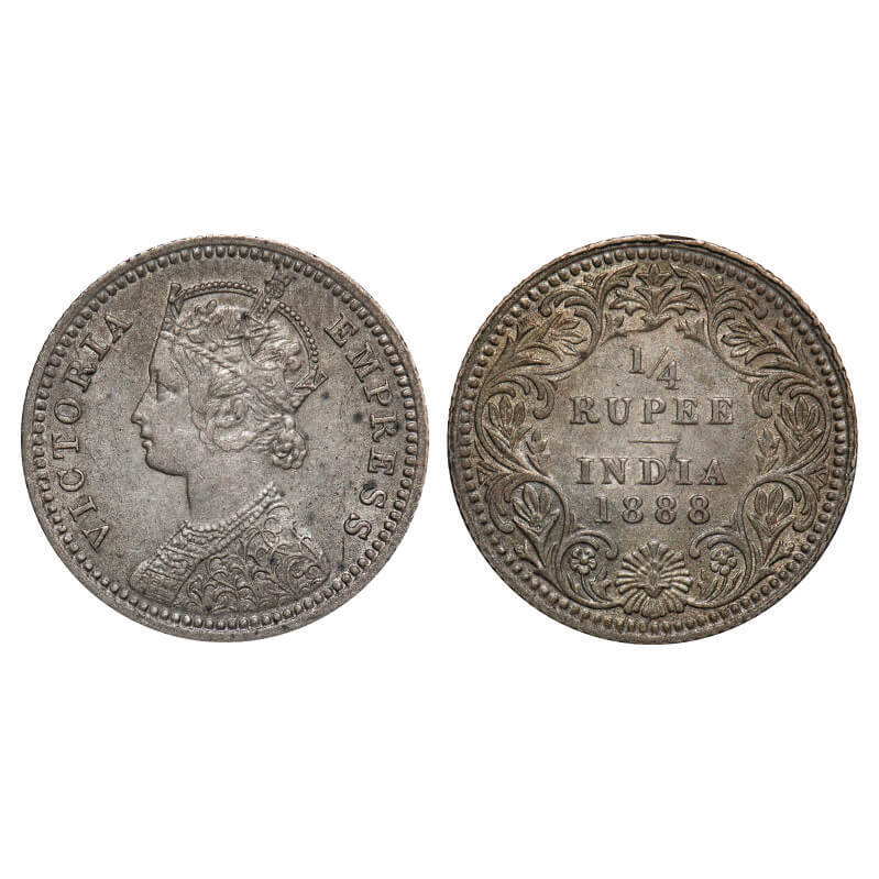 Victoria Empress, Silver, 1/4 Rupee, 1888, Calcutta Mint, C/II, No mint mark, No 'C'. F. Prid 393. GK 713. Extremely Fine+. Very Scarce.
