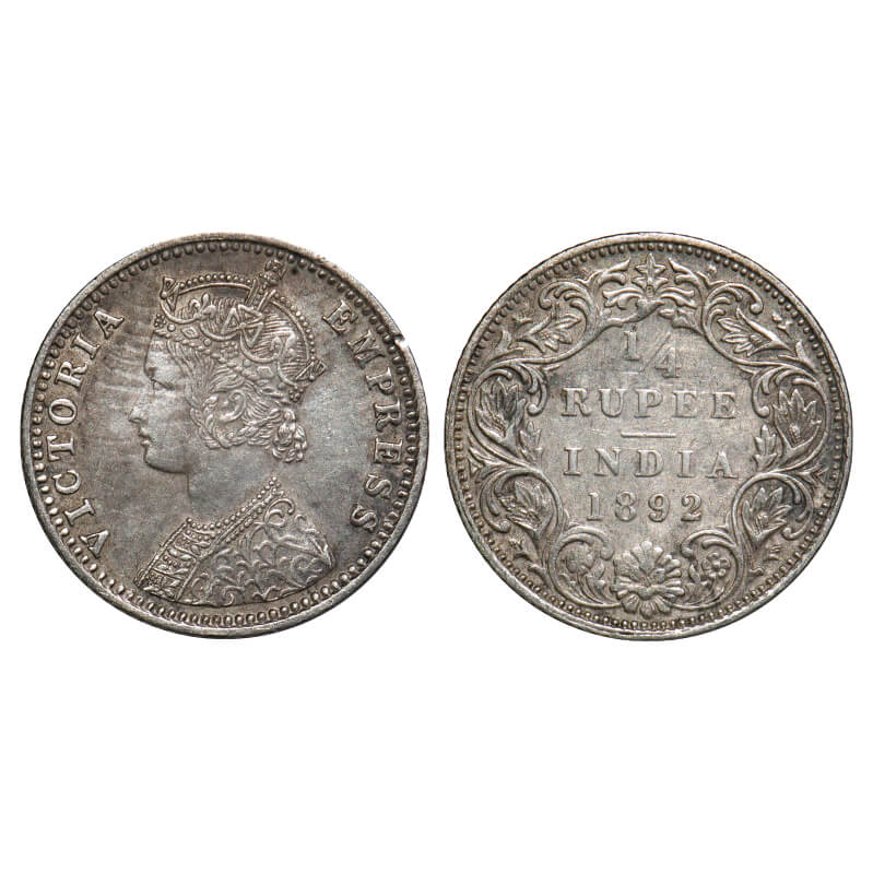 Victoria Empress, Silver, 1/4 Rupee, 1892, Bombay Mint, C(i)/I, 'B' incused. F. Prid 426. GK 722. Extremely Fine. Rare.