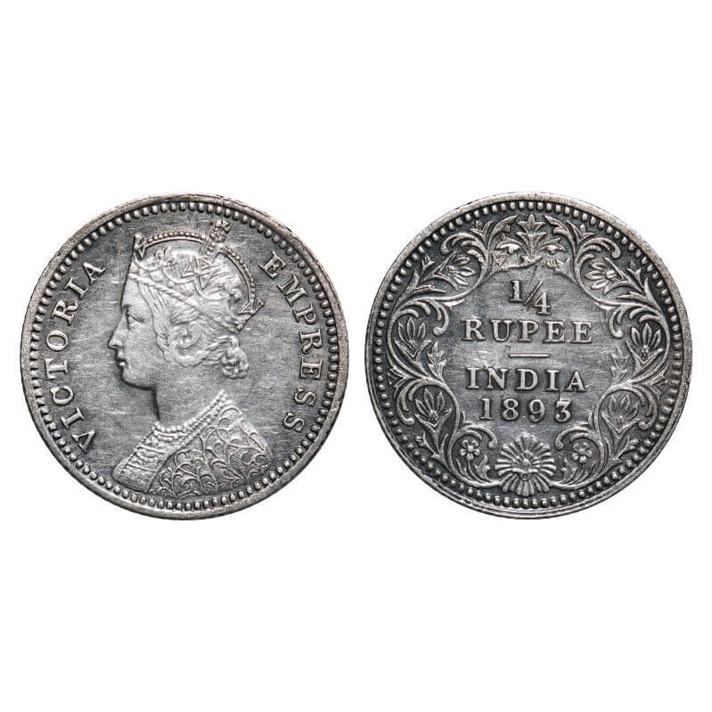 Victoria Empress, Silver, 1/4 Rupee, 1893, Calcutta Mint, C/II, 'C' incused. F. Prid 398. GK 725. Very Fine+. Scarce.