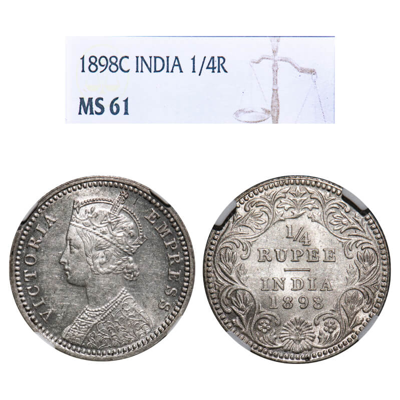 Victoria Empress, Silver, 1/4 Rupee, 1898, Calcutta Mint, C/II, 'C' incused. F. Prid 402. GK 735. NGC Slabbed MS 61. Rare.