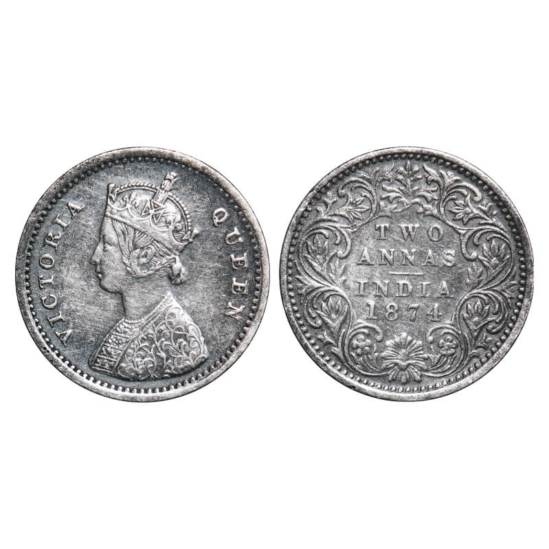 Victoria Queen, Silver, 2 Annas, 1874, Bombay Mint, A/I, No mint mark, No dot. F. Prid Unlisted. GK 738. Very Fine+. Very Scarce.