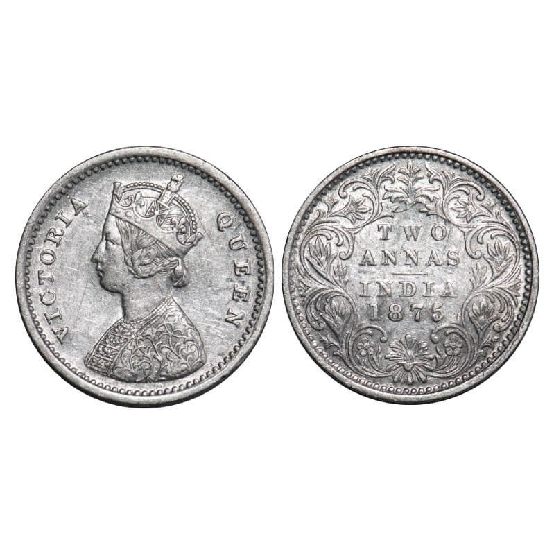 | Victoria Queen, Silver, 2 Annas, 1875, Bombay Mint, A/I, No mint mark, No dot, Ghost on Rev. F. Prid 517. GK 741. About Uncirculated. Very Scarce. |