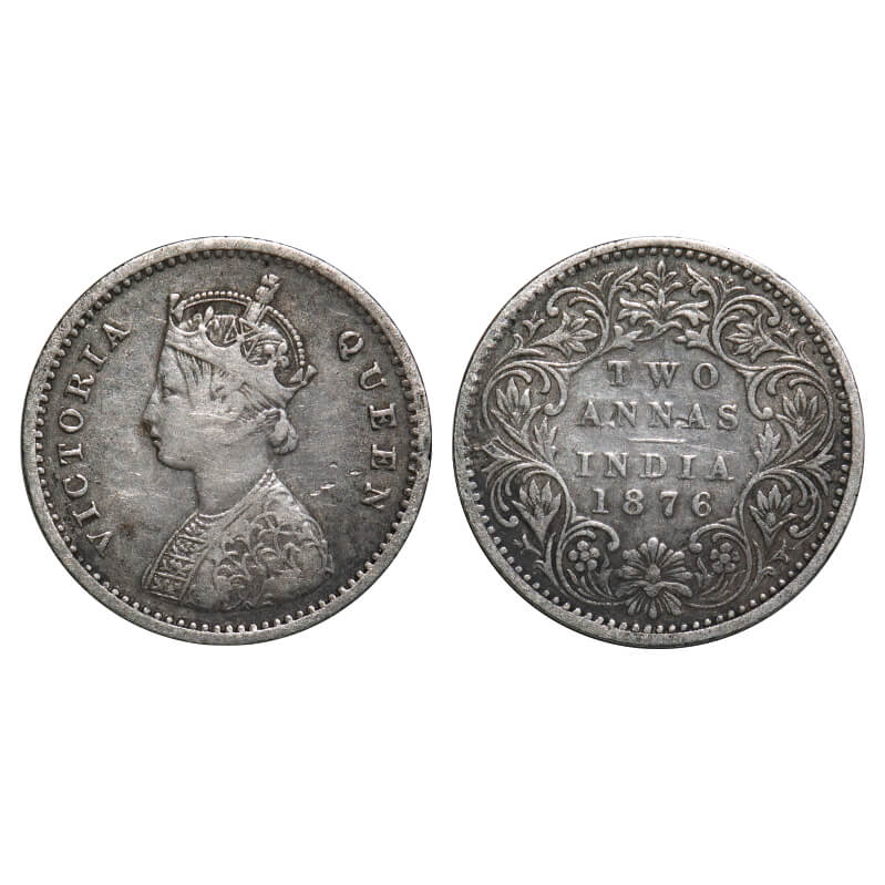 Victoria Queen, Silver, 2 Annas, 1876, Calcutta Mint, A/I, No mint mark. F. Prid 490. GK 745. About...