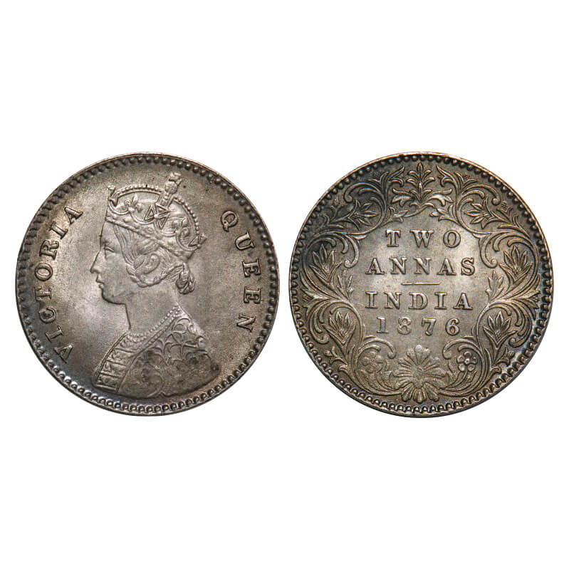 Victoria Queen, Silver, 2 Annas, 1876, Calcutta Mint, A/I, No mint mark. F. Prid 490. GK 745. About Uncirculated. Rare.