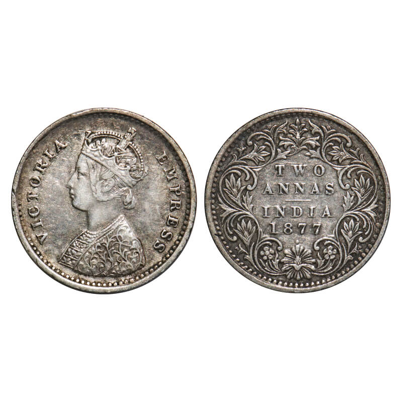 Victoria Empress, Silver, 2 Annas, 1877, Calcutta Mint, A/I, No mint mark. F. Prid 491. GK 748. Fin...
