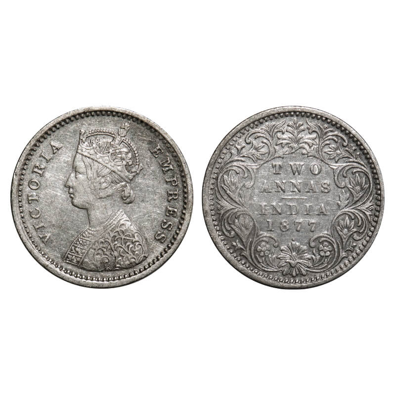 Victoria Empress, Silver, 2 Annas, 1877, Calcutta Mint, A/I, No mint mark. F. Prid 491. GK 748. Fin...