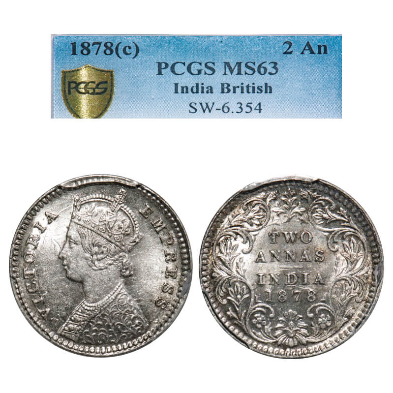 Victoria Empress, Silver, 2 Annas, 1878, Calcutta Mint, B/II, No mint mark. F. Prid 493. GK 751. NGC Slabbed MS 63. Very Rare.