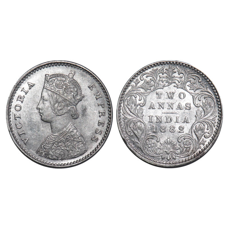 Victoria Empress, Silver, 2 Annas, 1882, Bombay Mint, A/I, Dot. F. Prid 525. GK 759. Almost Uncirculated. Rare.
