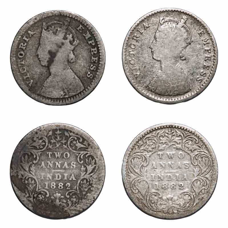 | Victoria Empress, Silver, 2 Annas, (2 coins), 1882, Bombay Mint, 1) A/I, Dot, 2) B/I, Dot. F. Prid 525, Unlisted. GK 759, 761. Fine to Fine+. Scarce. |