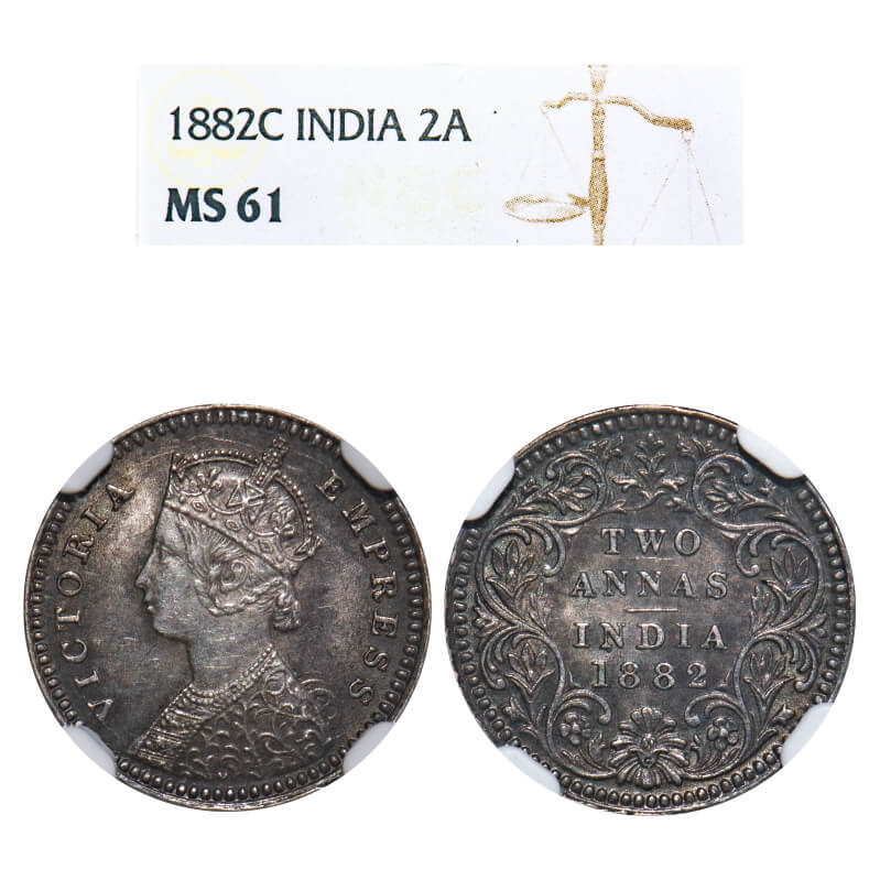 Victoria Empress, Silver, 2 Annas, 1882, Calcutta Mint, B/II, 'C' incused. F. Prid 497. GK 763. NGC Slabbed MS 61. Very Rare.